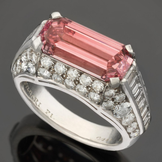 The Bulgari "Trombino" ring dates to the early seventies. Crafted in platinum, it contains a precious rectangular step-cut pink diamond of 3.18 carats. The GIA certificate attests it is a Natural Fancy Intense Pink, VS2, Type IIa. In other words, a gem of timeless allure—among the most sought-after and desired worldwide.