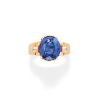 in yellow gold with oval-cut sapphire, weighing approx. 5.00 ct, flanked by two baguette-cut diamonds.