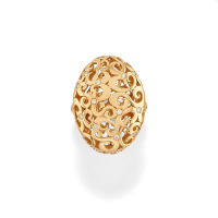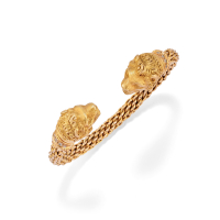 in yellow gold with an intertwined shank, ending in finely engraved lion heads adorned with diamond collars.