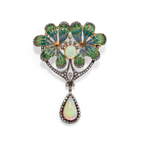 in yellow gold and silver designed with floral motif with plique-à-jour enamel and a pear-cut opal with huit-huit cut diamonds. Art Nouveau.