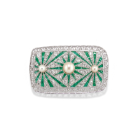 designed as a white rectangular shape with rounded corners, made with a pavé-set of Old Mine-cut diamonds and step-cut emeralds, embellished with three pearls arranged in a line. Circa 1940.