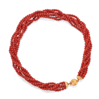 designed as a torchon with six strands of polished Japanese coral, held by a fluted polished yellow gold candy-shaped clasp.