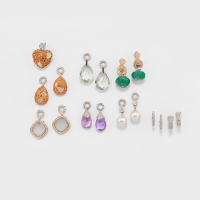 A group composed of various pairs of earrings in 18 kt white and yellow gold, some adorned with colored gemstones (amethyst, prasiolite, green onyx), pearls, and brilliant-cut diamonds. The collection also includes