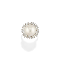 in 18K white gold with a South Sea pearl measuring 12.80 mm framed by brilliant- and shield-cut diamonds weighing approx. 1.90 ct. Circa 1970.