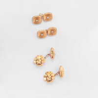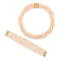 including a seven-strands necklace and a six-strands bracelet of pink coral beads. Both with yellow gold clasp.