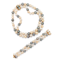 with multi-colored Australian pearls measuring from 11,00 mm to 15,00 mm, including a two-strand necklace with a yellow gold ovoid clasp and a two-strand bracelet with a yellow gold ovoid clasp. Signed and with the original case of Alex Jona