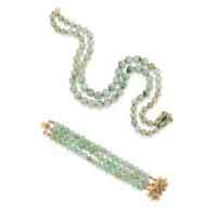 including a two-strand necklace of green jadeite spheres with a yellow gold clasp, jade petals, various-cut sapphires, and huit-huit cut diamonds; a three-strand bracelet of green jadeite spheres with a double flower clasp in yellow gold, jadeite