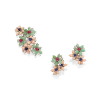 in platinum including a brooch and a pair of earrings designed as a floral motif set with rubies cabochon, sapphires cabochon, multicolored gemstone cabochons and brilliant-cut diamonds. In Fasano, Torino case.