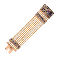 in yellow gold designed as ten thin strands held by two bar elements adorned with enamel, Old Mine-cut and rose-cut diamonds weighing approx. 1.50 ct and red stones. One diamond and one red stone deficient.