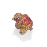 in white and yellow gold depicting a panda in yellow, champagne and pink sapphires weighing approx. 24.00 ct and eyes set with diamonds weighing approx. 0.04 ct.