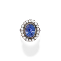 in white gold with a central oval cabochon sapphire weighing approx. 5.00 ct with a frame of round brilliant-cut diamonds weighing approx. 1.00 ct.