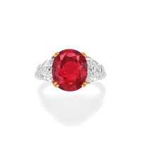 in platinum set with two half-moon-cut diamonds weighing approx. 1.65 ct together and a central oval step-cut ruby weighing 4.72 ct. Signed CUSI. Accompanied by CUSI expert estimate and Gubelin certificate from 1992, and by SSEF certificate