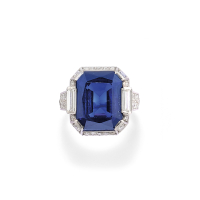 in platinum set with simple-cut diamonds and an emerald-cut synthetic sapphire weighing approx. 12.50 ct. Circa 1920.