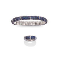 in white gold, including a bracelet and a ring, both designed as extendable spring bands adorned with small diamonds weighing approx. 1.50 ct and sapphires weighing approx. 13.00 ct.