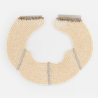 in white gold designed as 14 strands of pearls held together with white gold and diamond-set vertical elements.