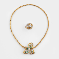 in yellow and white gold, the necklace designed as bamboo elements with central naturalistic motif with round brilliant- and Old Mine-cut diamonds weighing approx. 1.60 ct all together and emeralds weighing approx. 1.00 ct. The ring