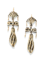 in low-karat rose gold with shell surmount suspending a drop pendant with small natural pearls. Minor defects, one small pearl deficient. Central Italy, circa 1850.