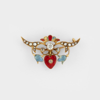 in 9K yellow gold with small pearls, a central diamond and a small pendent heart in red enamel.