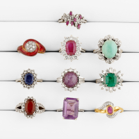 in white and yellow gold of varying karats and of various designs and highlighted with different coloured gems and diamonds.