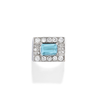 in white gold with a rectangular step-cut blue topaz weighing approx. 2.40 ct and round brilliant-cut diamonds weighing approx. 1.10 ct. One diamond chipped.