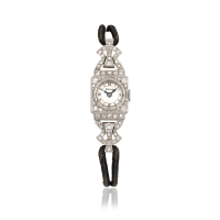 Case: in 18K white gold, hinged caseback, articulated lugs and extensions with Art Déco motif and stone decorations.