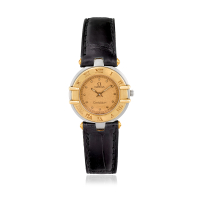 Case: signed, in stainless steel, snap-on caseback, gold bezel with engraved indexes.