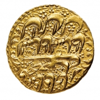 Periodo dell'invasione dei Chola (990-1070) - Kahavanu - Diritto: il Re seduto a destra tiene un guscio di conchiglia - Rovescio: Vushnu stante di fronte tiene un fiore - gr. 4,37