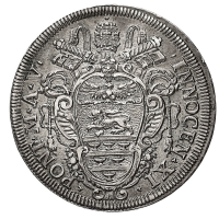 Innocenzo XI (1676-1689) - Testone 1677 Anno V - Zecca: Roma - Diritto: stemma sormontato dalle chiavi decussate seminascoste e dalla tiara - Rovescio: San Pietro stante a destra con le chiavi erette nella mano sinistra si volge all'indietro per sollevare da terra uno read all