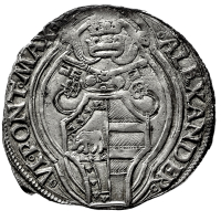 Alessandro VI (1492-1503) - Grosso - Zecca: Roma - Diritto: stemma sormontato dalle chiavi decussate e dalla tiara - Rovescio: San Paolo e San Pietro stanti di fronte - gr. 3,32 - Lievi corrosioni del metallo, comunque SPL
