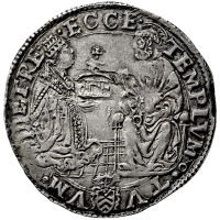 Leone X (1513-1521) - Giulio - Zecca: Ancona - Diritto: facciata della Basilica di San Pietro - Rovescio: il Papa inginocchiato a destra offre la Basilica a San Pietro di fronte a lui - gr. 3,78 - Molto rara - SPL