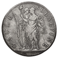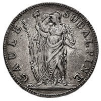 5 Franchi Anno 10° - Zecca: Torino - Diritto: due figure allegoriche stanti con due simboli della Rivoluzione Francese - Rovescio: valore, data e segno di zecca entro due rami di palma e di alloro intrecciati alla base - Sigillata ("BB/BB+")