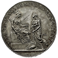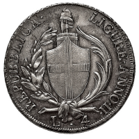 4 Lire 1799 - Zecca: Genova - Diritto: stemma di Genova su fascio tra due rami di alloro e di palma - Rovescio: due figure allegoriche stanti con alcuni simboli della Rivoluzione Francese - gr. 16,58 - Non comune - Patina di medagliere, q.SPL