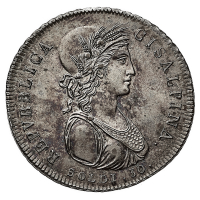 Scudo da 6 Lire Anno VIII (1799-1800) PCGS AU 58 - Zecca: Milano - Diritto: la Repubblica Cisalpina stante a sinistra ringrazia la Francia seduta a destra - Rovescio: valore e data entro corona di quercia - Cert. #48149918
