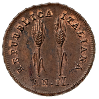 Progetto del 2 Denari Anno II (1803) - Zecca: Milano - Diritto: due spighe di grano - Rovescio: valore su due righe orizzontali - gr. 3,35 - Molto rara - Rame rosso, q.FDC - Corredata dal cartellino di Oscar Rinaldi