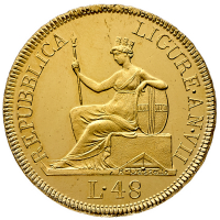 48 Lire 1804 - Zecca: Genova - Diritto: la Repubblica turrita seduta a sinistra tiene una lancia con la mano destra e appoggia il braccio sinistro su uno scudo con stemma - Rovescio: fascio con ascia e berretto frigio fra due rami di alloro intrecciati alla base - gr. read all