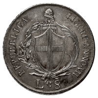 8 Lire 1804 - Zecca: Genova - Diritto: stemma di Genova su fascio tra due rami di alloro e di palma - Rovescio: due figure allegoriche stanti con alcuni simboli della Rivoluzione Francese - gr. 33,17 - Non comune - Patina iridescente, SPL