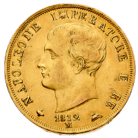 Napoleone I Re d'Italia (1805-1814) - 40 Lire 1812 - Zecca: Milano - Diritto: effigie di Napoleone a sinistra - Rovescio: stemma sovrapposto all'aquila napoleonica entro un padiglione coronato e riccamente ornato - gr. 12,85 - q.SPL