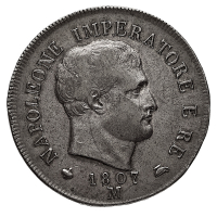 Napoleone I Re d'Italia (1805-1814) - 2 Lire 1807 - Zecca: Milano - Diritto: effigie di Napoleone a destra - Rovescio: stemma sovrapposto all'aquila napoleonica entro un padiglione coronato e riccamente ornato - gr. 10,00 - Lieve colpetto sul contorno, migliore di BB