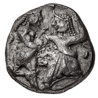 Mende - Tetradramma databile al periodo 460-423 a.C. - Diritto: Dioniso sdraiato sul dorso di un mulo al passo verso destra tiene un kantharos con la mano destra; sulla destra un uccello su una pianta - Rovescio: legenda attorno a un quadrato con all'interno cinque read all