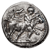 Larissa - Dracma databile al periodo 480-420 a.C. - Diritto: Thessalos stante a destra tiene un toro per le corna e il collo - Rovescio: cavallo al galoppo verso destra entro un quadrato in incuso - gr. 6,07 - Rara - Metallo lucente, SPL - Proveniente dall'asta Dr. read all