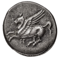 Anaktorion - Statere databile al periodo 350-300 a.C. - Diritto: Pegaso in volo verso destra - Rovescio: testa elmata di Atena a sinistra; nel campo, a sinistra, un monogramma, a destra, un bucranio - gr. 8,59 - Migliore di BB