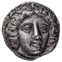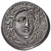 Rodi - Tetradramma databile al periodo 404-385 a.C. - Diritto: testa di Helios di tre quarti verso destra - Rovescio: rosa con germoglio a destra; nel campo a sinistra, una spiga di grano - gr. 15,09 - Molto rara - Magnifico stile, alti rilievi e patina di medagliere, read all