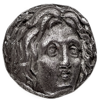 Didramma databile al periodo 250-230 a.C. - Diritto: testa radiata di Helios di tre quarti - Rovescio: rosa con germoglio a destra; nel campo a sinistra una figura umana stante a sinistra - gr. 6,82 - Patina di medagliere, SPL - Proveniente dall'asta Arsantiqva III, read all