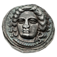 Pharnabazos (379-374 a.C.) - Statere - Zecca: Tarsos - Diritto: testa di Ninfa di fronte, leggermente rivolta a sinistra - Rovescio: testa maschile a destra con elmo attico ornato e crestato - gr. 10,60 - Splendida patina, SPL