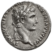 Denario databile al periodo 2 a.C .- 4 d.C. - Zecca: Lugdunum - Diritto: testa laureata dell'Imperatore a destra - Rovescio: Caio e Lucio, nipoti dell'Imperatore, stanti di fronte in toga, reggono ciascuno uno scudo e una lancia posati a terra, sopra i quali campeggiano read all