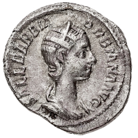 Denario al nome e con l'effigie di Orbiana, moglie dell'Imperatore, databile a dopo il 225 d.C. - Zecca: Roma - Diritto: busto diademato e drappeggiato di Orbiana a destra - Rovescio: la Concordia seduta a sinistra tiene una patera con la mano destra e una doppia read all