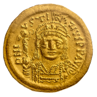 Maurizio Tiberio (582-602) - Solido databile al periodo 583-601 - Zecca: Costantinopoli - Diritto: busto elmato e diademato dell'Imperatore di fronte con il globo crucigero nella mano destra - Rovescio: un angelo stante di fronte tiene un'asta culminante con il read all