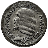 Ludovico III Gonzaga Marchese II (1444-1478) - Mezzo Testone - Diritto: croce accantonata da quattro aquile in corona di alloro - Rovescio: la pisside in corona di alloro - gr. 3,37 - Rara - q.BB - Corredata dal cartellino di Oscar Rinaldi