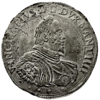 Francesco II Gonzaga Marchese IV (1489-1519) - Testone - Diritto: busto del Marchese a sinistra - Rovescio: crogiuolo con verghe fra le fiamme - gr. 9,68 - Molto rara - Piacevole patina iridescente, q.SPL