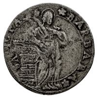 Vincenzo I Gonzaga (1587-1612) - Barbarina anonima - Diritto: Santa Barbara stante tiene con la mano destra la palma e si appoggia ad una torre - Rovescio: pianta di girasole con le foglie aperte verso il sole - gr. 1,95 - BB